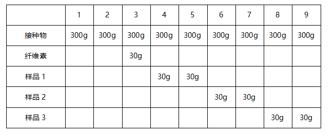 此为某单位采用M9000型堆肥红外法生物降解仪,参考GB/T19277.1-2011的方法标准,检测某样品的可生物降解性的实验结果,试验周期为70天,由图1可知,45天内纤维素的降解率达到了81.88%,70天内纤维素的降解率达到了98.18%,此时各实验组的增长基本结束,曲线平缓,实验设计如下表所示: