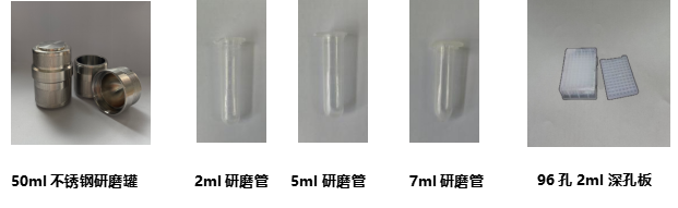 研磨罐用来盛装研磨球和样本,直接夹在主机上使用。研磨管用来盛装研磨球和样本。深孔板可代替适配器,直接盛装样品及研磨球,安装在主机上进行研磨。