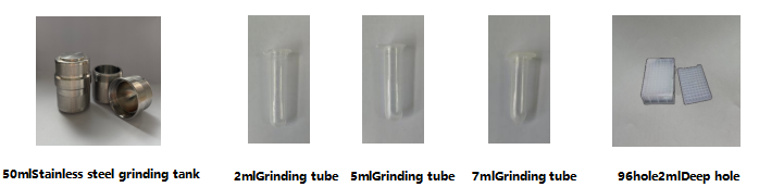 The grinding tank is used to hold the grinding ball and sample, which is directly clipped to the main engine for use. The grinding tube holds the grinding ball and sample. The deep hole plate can replace the adapter, directly contain the sample and grinding ball, installed on the main machine for grinding.