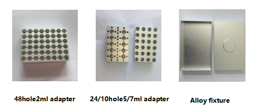 The adapter is used to hold the grinding tube containing the grinding ball and sample, and is positioned in the middle of the alloy fixture for use on the equipment. 48 holes (2ml), 24 holes (5ml), 10 holes (7ml) are optional.