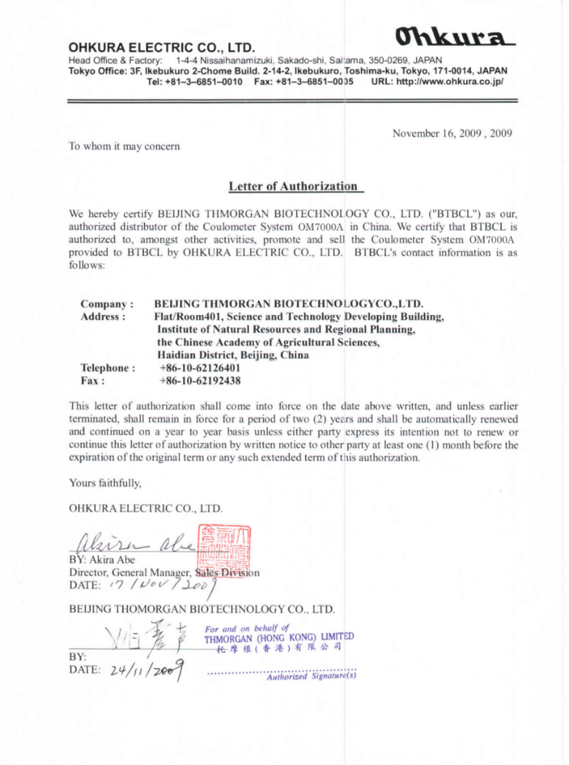 2009年,托摩根生物就与日本大仓电气株式会社达成合作协议,并正式签署代理授权书。托摩根生物成为日本大仓生物降解仪系列产品在中国区域总代理,负责中国地区的市场推广、渠道建设、销售和售后工作。
