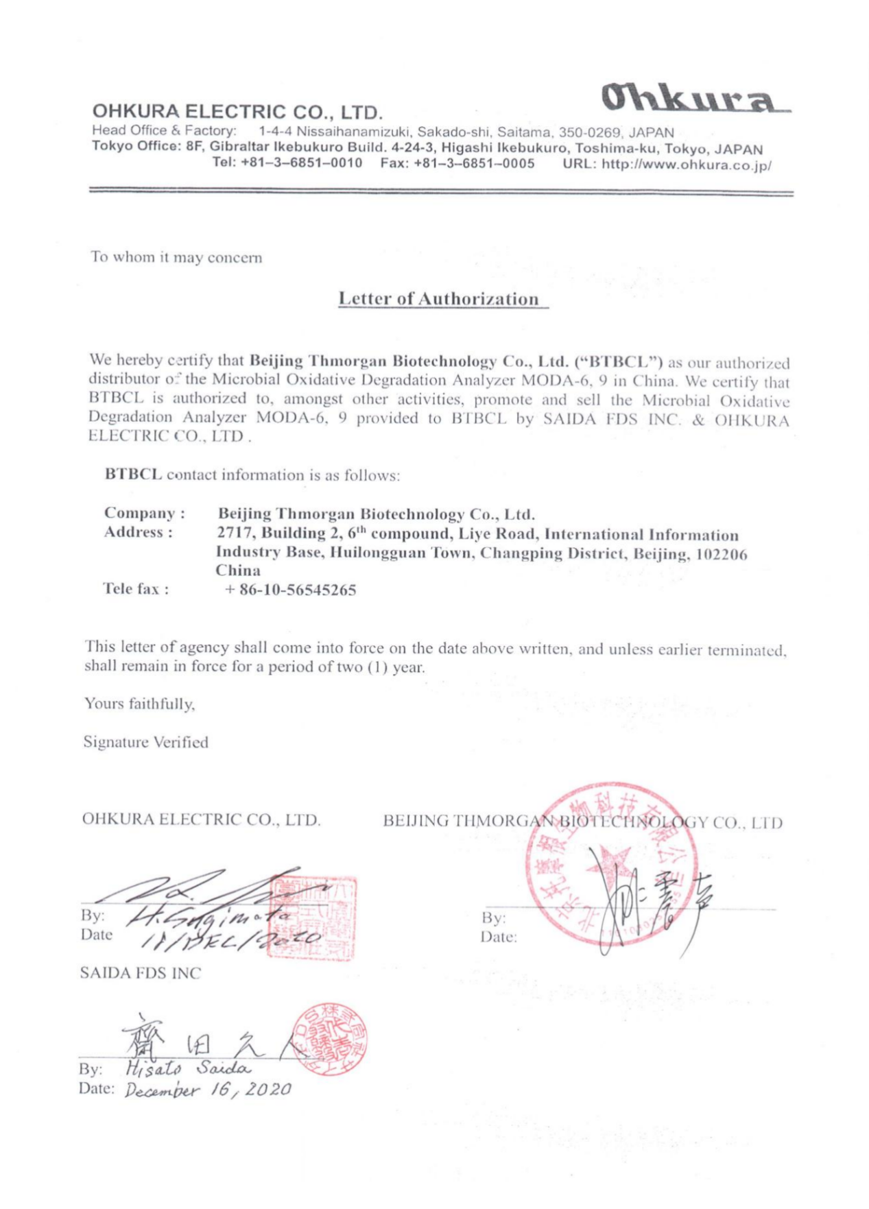2020年,托摩根生物就与日本SAIDA达成合作协议,并正式签署代理授权书。托摩根生物成为日本SAIDA生物降解仪MODA-6/MODA-9在中国区域总代理,负责中国地区的市场推广、渠道建设、销售和售后工作。