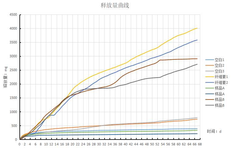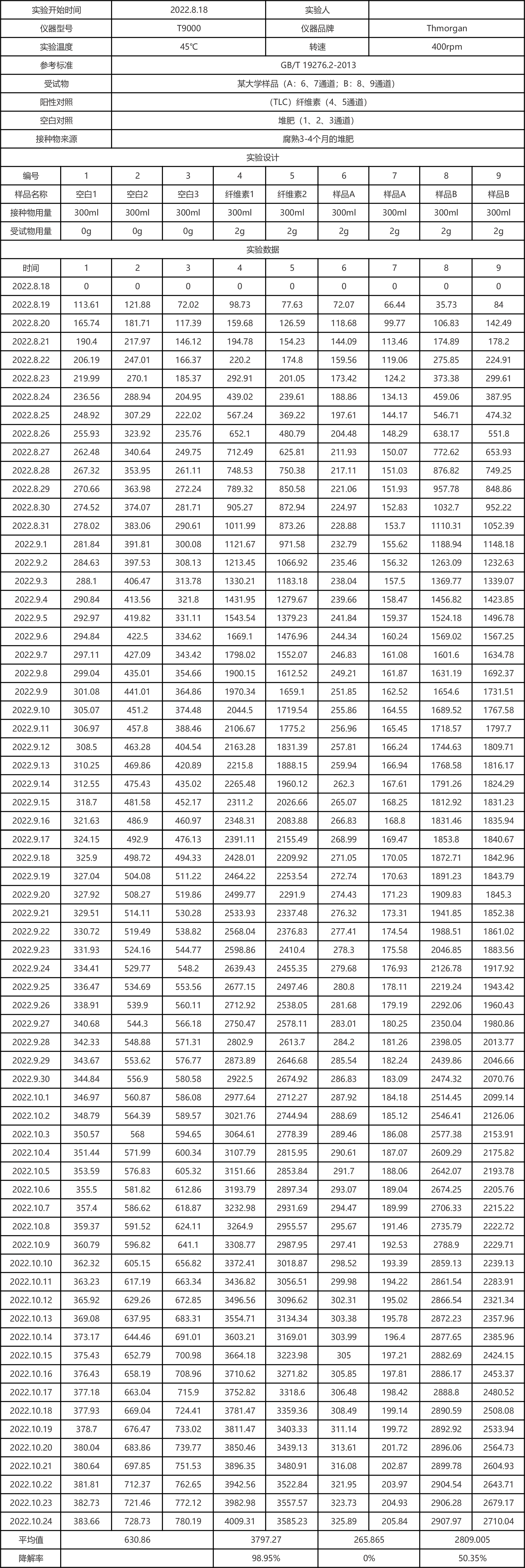 结论: 1. 本次实验自2022年8月18日开始,到报告之日,持续了67天。 2. 67天内纤维素的生物降解率达到98.95%;在67天内,空白组平均CO2释放量为630.86 mg。 3. 纤维素降解速度持续增加,各平行对照之间差异较小。 4. 67天内样品A的生物降解率为0%,降解速度较慢,且有抑制现象;样品B的生物降解率为50.35%。 |