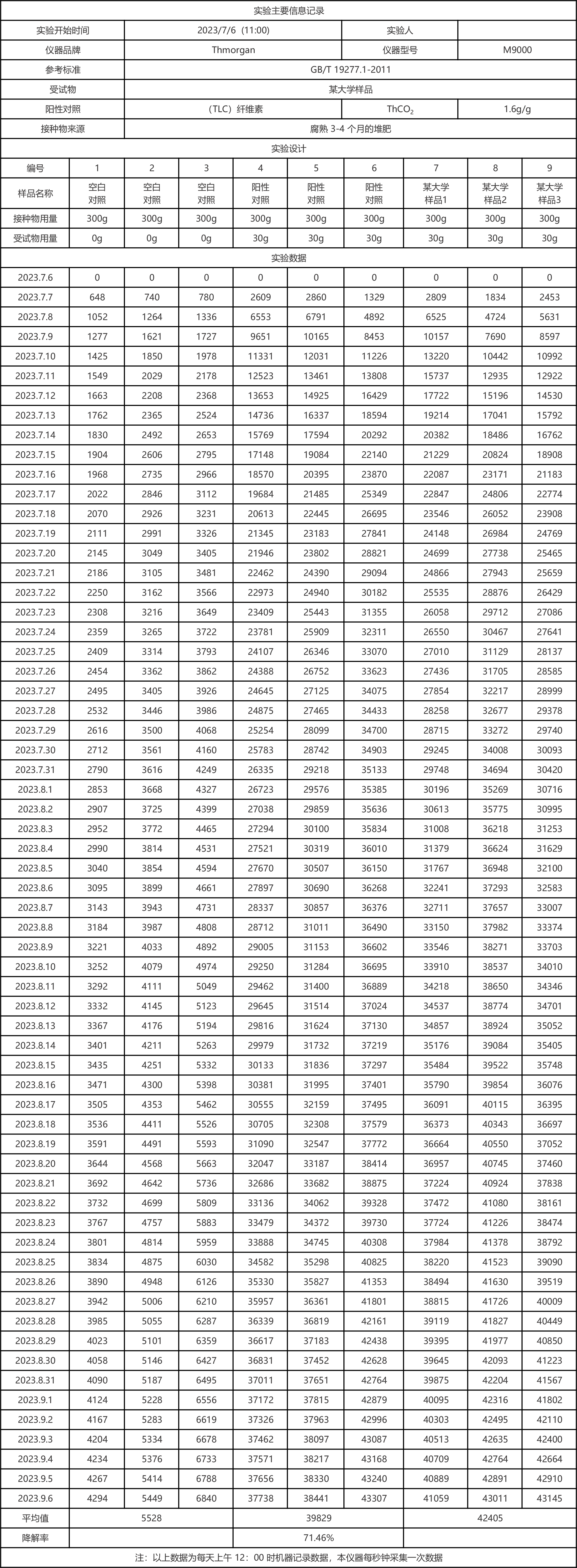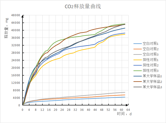 5、数据整体分析:实验组的平行性较好,满足GB/T 19277.1中生物分解百分率相对偏差低于20%的要求;对照组与实验组降解速度趋于平稳。